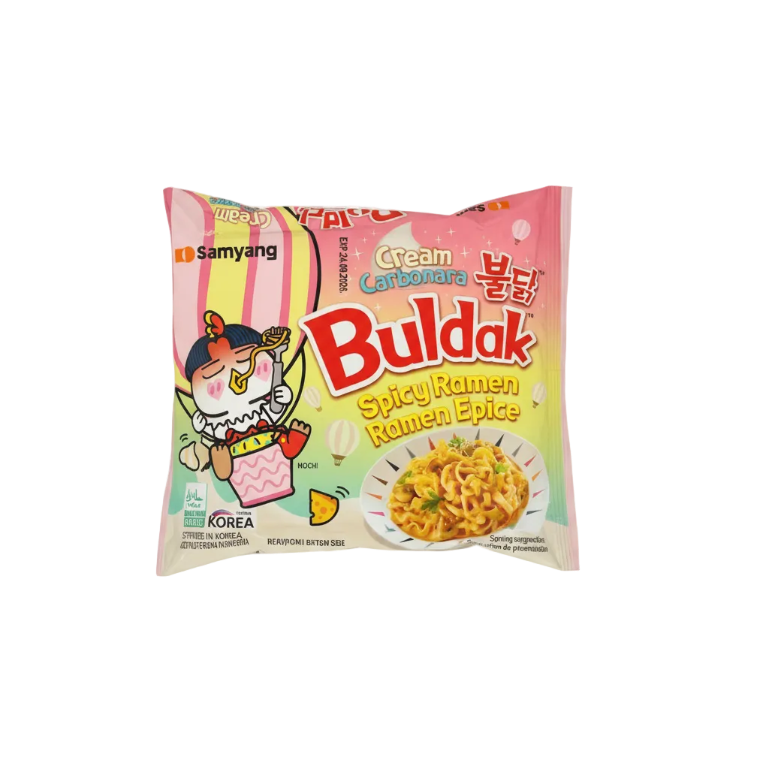 Les nouilles Samyang Buldak – Cream Carbo au poulet épicé (140 g) allient le piquant caractéristique de la gamme Buldak à la douceur crémeuse du fromage. Leurs nouilles extra-épaisses absorbent parfaitement la sauce épicée, offrant une expérience gustative intense et savoureuse, à l'équilibre idéal entre piquant et onctuosité.